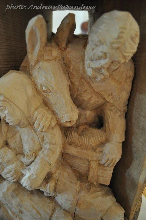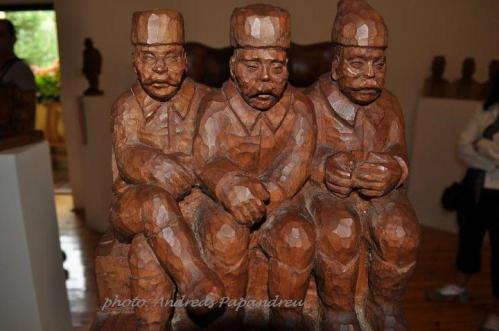 Mielőtt a kiállítóterembe beléptünk volna, kedvesen köszöntöttek minket és pár szót meséltek arról, hogy mit fogunk látni. Orisek Ferenc nem végzett képzőművészetet vagy egyéb művészeti szakot, autodidakta módon kezdte el a fafaragást és csodálatos dolgok kerültek ki a keze alól. Elmondása szerint rengeteg művével már nem találkozhat, ezért egy adott pillanatban úgy döntöttek feleségével, helyi kis kiállítótermet rendez be azoknak a daraboknak, melyek még nála vannak. Így került aztán képbe a volt iskola épülete és költöztek majd erre a helyre. Ritkán készített eladásra, most már egyáltalán nem, inkább közterületekre vagy középületekbe szereti műveit kiállítani, adományozni. Valamikor 5 évig Brassóban élt, amikor ott a műszaki egyetemet végezte, hihetetlen tiszta kiejtéssel és hibátlanul szólt hozzám és beszélgetett románul, el nem tudom képzelni 49 óta hogy is nem felejtette el. Arról is mesélt, milyen kevés volt a román Brassóban, hogy csak csoportosan mertek járni, féltek, nehogy megverjék őket a magyarok a legkisebb feszültség kialakulása után. Elmesélt egy esetet, amikor a buszban egy pár román ült hátra és a magyar évfolyamtársai küldtek nekik egy üveg innivalót, mondván nekik, látják, idegenek, biztosan jólesik egy kis itóka. Hol vannak már azok az idők?:(