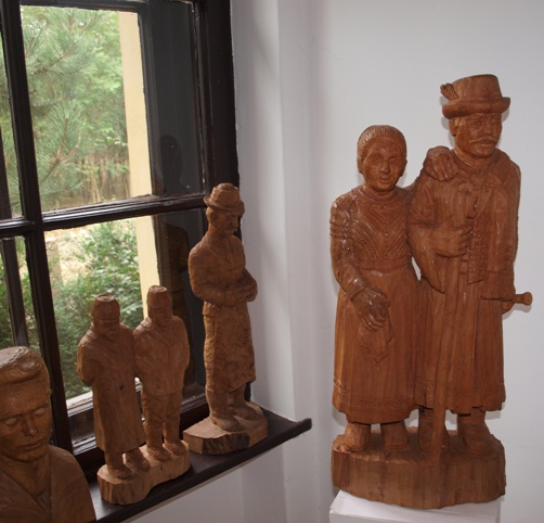 Mielőtt a kiállítóterembe beléptünk volna, kedvesen köszöntöttek minket és pár szót meséltek arról, hogy mit fogunk látni. Orisek Ferenc nem végzett képzőművészetet vagy egyéb művészeti szakot, autodidakta módon kezdte el a fafaragást és csodálatos dolgok kerültek ki a keze alól. Elmondása szerint rengeteg művével már nem találkozhat, ezért egy adott pillanatban úgy döntöttek feleségével, helyi kis kiállítótermet rendez be azoknak a daraboknak, melyek még nála vannak. Így került aztán képbe a volt iskola épülete és költöztek majd erre a helyre. Ritkán készített eladásra, most már egyáltalán nem, inkább közterületekre vagy középületekbe szereti műveit kiállítani, adományozni. Valamikor 5 évig Brassóban élt, amikor ott a műszaki egyetemet végezte, hihetetlen tiszta kiejtéssel és hibátlanul szólt hozzám és beszélgetett románul, el nem tudom képzelni 49 óta hogy is nem felejtette el. Arról is mesélt, milyen kevés volt a román Brassóban, hogy csak csoportosan mertek járni, féltek, nehogy megverjék őket a magyarok a legkisebb feszültség kialakulása után. Elmesélt egy esetet, amikor a buszban egy pár román ült hátra és a magyar évfolyamtársai küldtek nekik egy üveg innivalót, mondván nekik, látják, idegenek, biztosan jólesik egy kis itóka. Hol vannak már azok az idők?:(