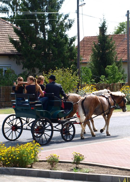 Már nagyon kellett sietnünk a nyammogással, mert már megjelentek az első szekerek. Ugyanis szekeres felvonuláson vettünk részt, teljes pompában, népviseletben, jó vastag anyagokban mi is, de a magyar Koccintósék is! Alig tudtuk lenyelni a falatot, már hajtott bennünket Klárika és a görögöket én: ELLA, ELLA, PAME, PAME!!!!!!!!!!!!!!!!!!!!!!! hogy legyen időnk átöltözni a Községházán, mielőtt a templom előtti téren felülünk a szekerekre.