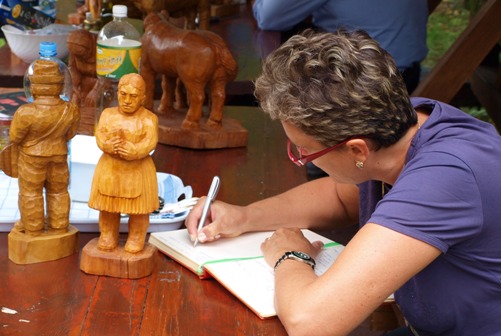 A szobor után már nagyon kíváncsiak voltunk magára a művészre, akinek a háza-táján berendezett kiállítása volt a következő célpont. Ahogy a busszal a régi tanyasi iskolához közeledtünk, megcsodálhattuk a homokos földet, mely annyira jellemző a pusztavidékre és a görögöknek teljesen szokatlan, de bevallom, nekem is. Kerestük a folyót, melynek medréhez tartozna a homok, de mondták nekünk, hogy nincsen víz, ez jellegzetes talaj. Sikerült a homokos út ellenére a busszal sikeresen eljutni a fafaragó művész úr házához, ahol nagy szeretettel fogadtak bennünket.