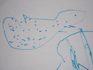 Ezt pont néztem, ahogy rajzolta, elég tudatosan készült, először pöttyök nélkül, akkor közölte, hogy delfin, majd mikor bepöttyözte: gepárd testű delfin. És elmutogatta, hogy hol a hátúszója, farkúszója, feje, szeme, teste. Nekem tetszik.