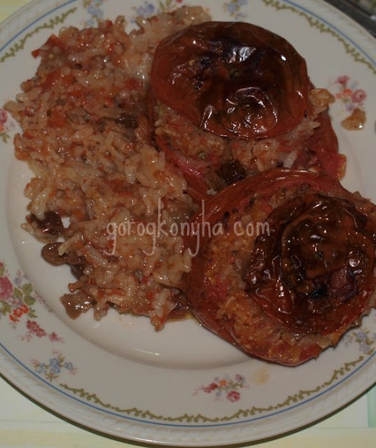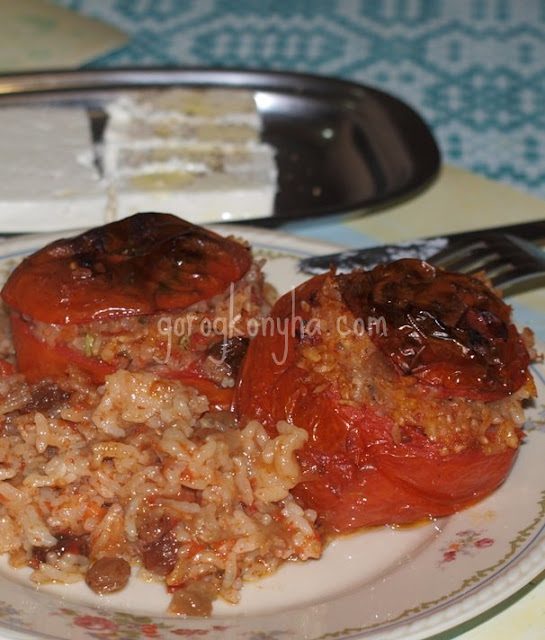 Az idén különösen hamar lehűlt a levegő. Ugyan még ott piroslanak a mezőkön az „opszima”, a késői paradicsomok, de nem tudom mennyire bírták ki a pár napos hideget és esőt. Ma délelőtt 7 fokot mutatott a hőmérő a balkonon, ami rendkívül alacsony hőmérséklet erre az évszakra és az Eviai viszonyokat tekintve. Volt nekem is pár túlérettnek tűnő paradicsomom, amikből még egyszer, utoljára az idén, töltött zöldségeket akartam készíteni. Erről is többször blogoltam, igaz, sosem készítem ugyanazon a módon. Most került a töltelék rizsbe bazsalikom és menta is, szomorúan tapasztaltam, hogy a mentámat a hideg teljesen kikezdte. A bazsalikom még bírja, de le kéne szednem minden zöldjét és lefagyasszam vagy szárítsam, mert látom, hogy nem sokáig lesz már ilyen szép. Volt egy üveg szétszáradt mazsolám, így ebből is került bele egy jó marék, finom édes ízt kölcsönözve a tölteléknek. A mélyhűtőből előkerült egy kisebb zacsi apróra vágott padlizsánbél, ezt az apróra vágott hagymával olívaolajon megfuttattam, mielőtt a töltelékbe került volna. A többi a szokásos: 2 kanál rizs/zöldség, só, bors, paprika, még 3-4 paradicsom is lemixelve a kikapart felmixelt paradicsombelek mellé.