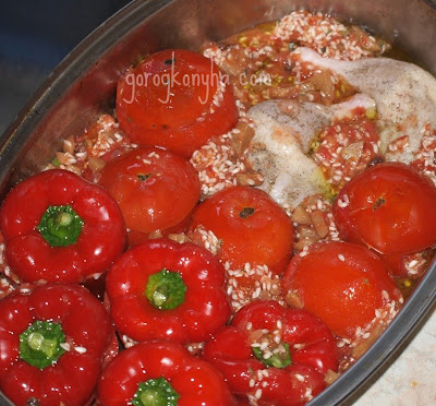 Finom lett, de nekem már nagyon hiányzanak azok a nagyon nagy és leves, túlérett, illatos nyári paradicsomok, így tavaszig nem készítek több ilyet. A paprika a piros, vastag héjúból volt, ide is tetszett volna ha bekerül 1-2 mezei zöld is. Azért a 10 ujjunkat megnyaltuk utána:) Nyafogós fiam részére 2 csirkecomb is került a tepsibe és melléje a töltelék csak úgy magában -ezt is most próbáltam először. Jó lett, de akinek készült, továbbra sem ette a rizst, csak a húst, így a műtét sikerült, a beteg elpatkolt szerű volt a mai alkotásom.