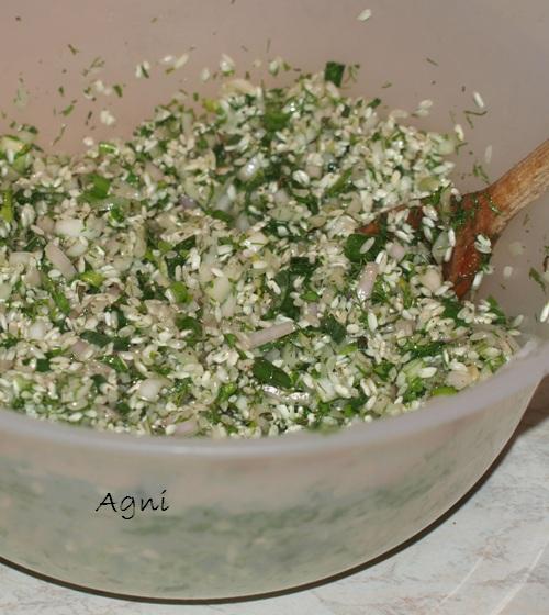 Miután ezzel megvagyok, nekifogok a töltelék elkészítésének. A rizshez keverek minden megtisztított, apróra vágott hozzávalót és az olajból is annyit öntök hozzá, hogy összeálljon az egész kicsit. Csak a citromlevet tartogatom a végére.