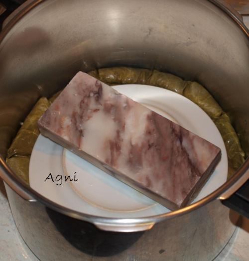Miután minden töltelék a fazékban pihen, leöntöm a citromlével, a maradék olívaolajjal, majd egy tányért helyezek az egészre, amire mindig egy nehezéket is szoktam tenni (a képen lévő túl nagy, de én ezt használom:))