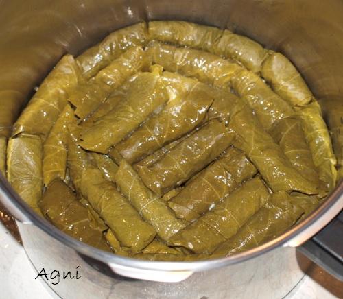 Összesen 150 levelem volt, melyek 600 gr-t nyomtak. Ebből teljesen véletlenül 75-t töltöttem meg és 75 maradt:) Még ha akartam volna sem sikerült volna pontosan annyi tölteléket készítenem, hogy a fele leveleket töltsem meg:) A maradék leveleket leforrázás és -csorgatás után, lefagyasztottam.