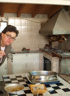 Vasárnap délelőtt így sült a bárány. A hasa alá tálat helyeztek, ebben gyűlt a zsíros sajtos mártás, amit folyamatosan mártogattunk kenyérrel, amíg a végén mire asztalhoz kerültünk, már majdnem jól voltunk lakva:) Nagyon nagyon finom ez a lé:)