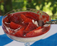 Az édesség egy rendkívül finom Panacotta volt (pana cotta=főtt krém olaszul). Ez egy olasz édesség, de már rég befolyt a görög konyhába is. Azért választottam ezt, mert egyrészt nagyon könnyű elkészíteni, másrészt hideg, hűsítő és nagyon talál az ilyen sütögetős ételekkel.