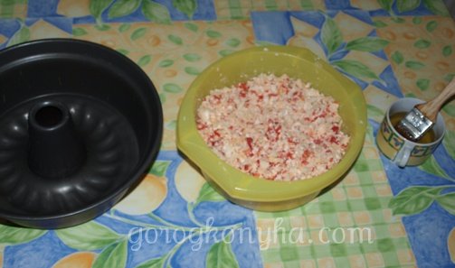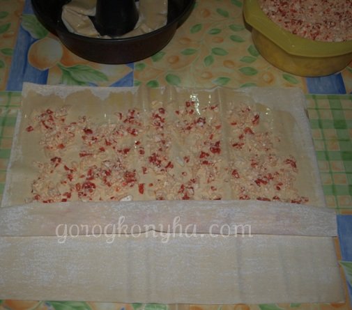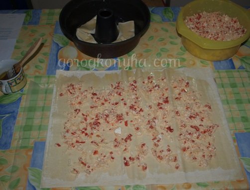 Az első lapot megkenjük olajjal, lazán felcsavarjuk és a formába tesszük. A második lapot is megkenjük olajjal, elszórjuk rajta a tölteléket, felcsavarjuk és a másik tekercsre helyezzük, miután annak felületét is megkentük olajjal.