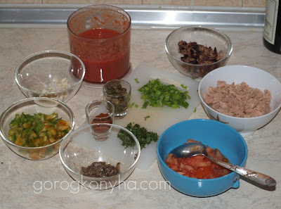 * 1ek sóban, ecetben eltett ajóka apróra felvágva (ez egy 15 cm-s halfajta, de lehet sózott heringet is használni helyette, de ha kimarad sem történik semmi:))