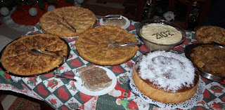 Aztán jobbról balra, a fenti képen elkezdett irányt megtartva: tejszínes krumpli sütőben, mellette póréhagymás kolbász (észak Görögországi jellegzetes karácsonyi eledel), aztán az én kalácsom, ami az újévi „vasilopita” szerepét tölti be és egy érem van benne eldugva, mellette a 2012-s feliratú „salate de beuf” amit ugyancsak én készítettem és a modern salátástálat ajándékba hoztam a háziasszonynak, a kalács mellett egy jellegzetes észak Görögországi étel, aminek a nevét ötször megkérdeztem, de ötször elfelejtettem. Ez kb. 5 fajta húsból készült hideg eledel, leginkább a kocsonyához közelít az állaga.Aztán a három pita, illetve rétesek: darált húsos, csirkehúsos és sajtos (tiropita). Mellettük a túlsó oldalon pedig kocsonya.