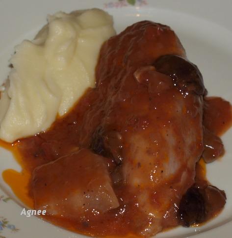 Ez alkalommal eltértem az általam megszokottól és a mártást besűrítettem egy kiskanál courn flour-l. Mi nagyok, krumplipürével ettük, amit ugyancsak rendhagyó módon nem vajjal és tejjel szoktam kikeverni, hanem a krumplikkal együtt főzők meg egy hámozott, magtalanított almát, ezt is a krumplikkal összetöröm, majd margarinnal és saját levével keverem ki. Így lesz nekünk egy finom egészségkímélő krumplipürénk, ami ha nem elég savanykás, még 2%-s joghurtot is keverek hozzá, kóstolgatva, addig, amíg ízlik.