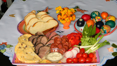 hagyományos húsvéti reggeli: sárgatúró, sonka, kolbász, kalács, friss zöldségekkel, tormával