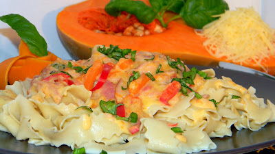 A mártáshoz a vajat felhevítem, hozzáadom az olívaolajat, hozzáadom a felkarikázott újhagymát kissé pirítom, hozzáadom a vékony csíkokra vágott sonkát és paprikát. Megsózom, meghintem frissen őrölt fekete borssal, majd hozzáadom a vékony csíkokra vágott sütőtököt és a reszelt sajtot. Mikor a sajt elolvadt, apróra vágott bazsalikomot adok hozzá, felöntöm a tejszínnel, és összeforralom.